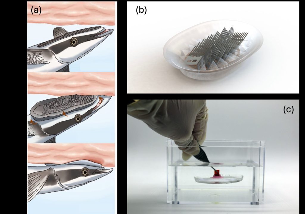 Ispirandosi a queste straordinarie strategie biologiche, gli scienziati hanno sviluppato MUSAS, un dispositivo a disco che imita la struttura del disco della remora. Realizzato in silicone e materiali intelligenti sensibili alla temperatura, MUSAS è dotato di lamelle inclinate e di microaghi metallici. Questi ultimi, attivati dal calore corporeo, si intrecciano col tessuto molle per una presa ancora più sicura. I ricercatori hanno dimostrato che MUSAS può aderire a una vasta gamma di superfici, dalle mucose gastriche dei suini ai guanti di nitrile, fino alla pelle di un pesce tilapia in acquario, mantenendo l’adesione anche in condizioni di forte acidità o umidità.