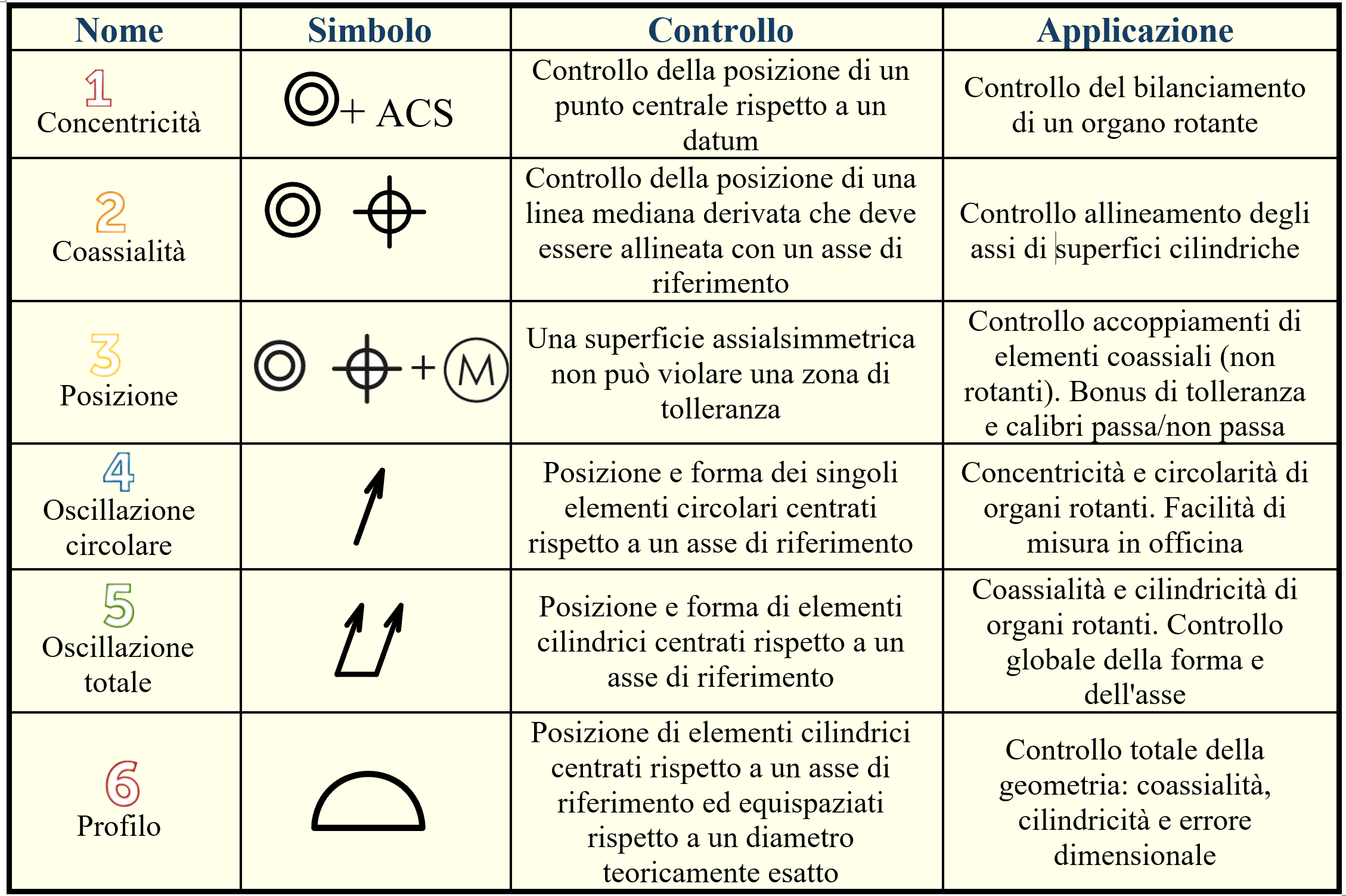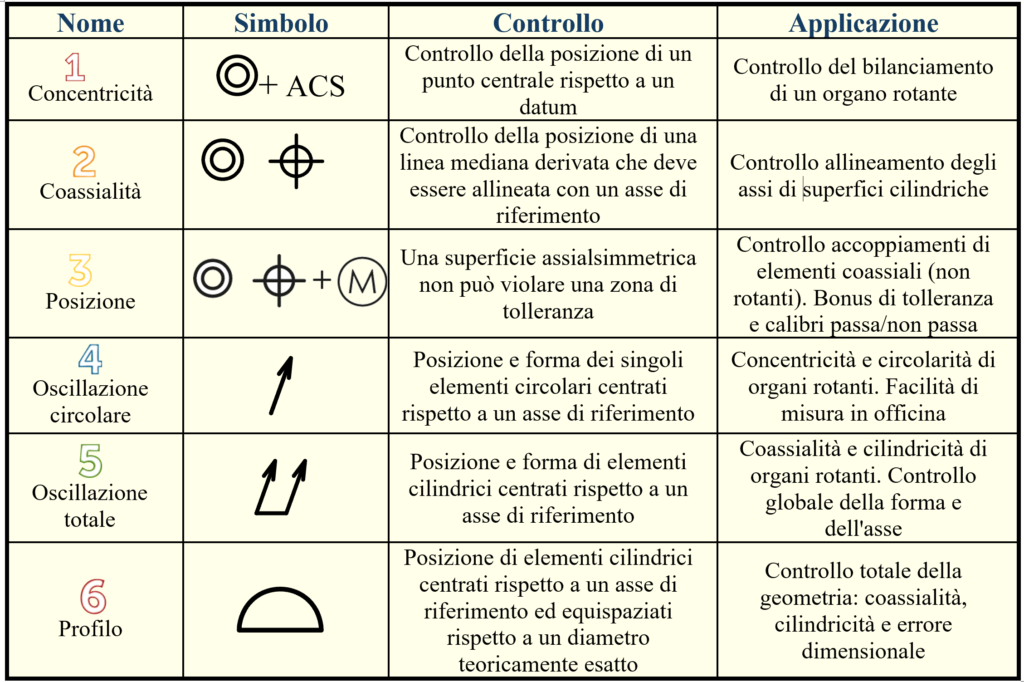 Esistono sei diverse metodologie per la specifica della coassialità a disegno. La scelta dell’approccio più idoneo dipende dalle esigenze funzionali del componente, con l’obiettivo di assegnare la massima tolleranza ammissibile che non pregiudichi le prestazioni. Le distinzioni tecniche tra queste opzioni sono sintetizzate nella tabella di Figura 1.