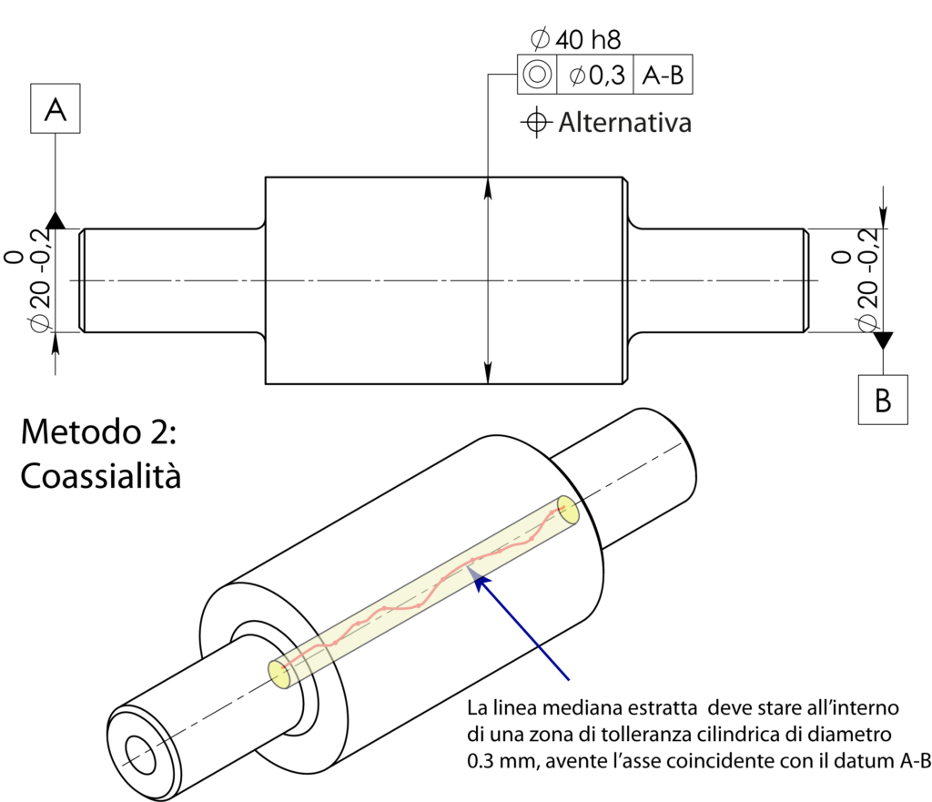 Il metodo più comune per limitare un errore di coassialità è indicato nella figura 3, e rappresenta un controllo specifico della tolleranza di posizione e applicata generalmente a organi rotanti.  In questo caso la linea mediana estratta dell’elemento centrale deve essere contenuta all’interno di un cilindro di diametro 0.3 mm, il cui asse è il common datum A-B. È opportuno evidenziare due considerazioni fondamentali: