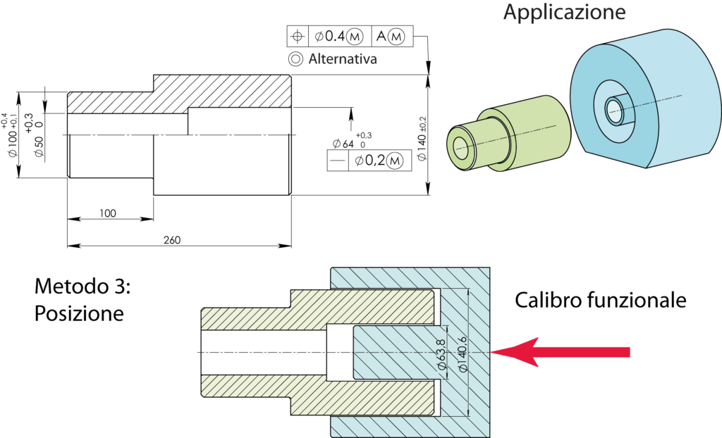 Per il controllo del componente di figura 4 viene utilizzato un calibro funzionale che rappresenta la materializzazione dell’elemento da accoppiare nelle condizioni peggiori. Le dimensioni del calibro, definite “dimensioni virtuali”, vengono calcolate aggiungendo (nel caso di alberi) o sottraendo (nel caso di fori) la tolleranza di posizione a quella di massimo materiale. L’impossibilità di accoppiamento del componente col calibro, pur restando nei margini delle tolleranze dimensionali, indica il raggiungimento del valore limite di coassialità.