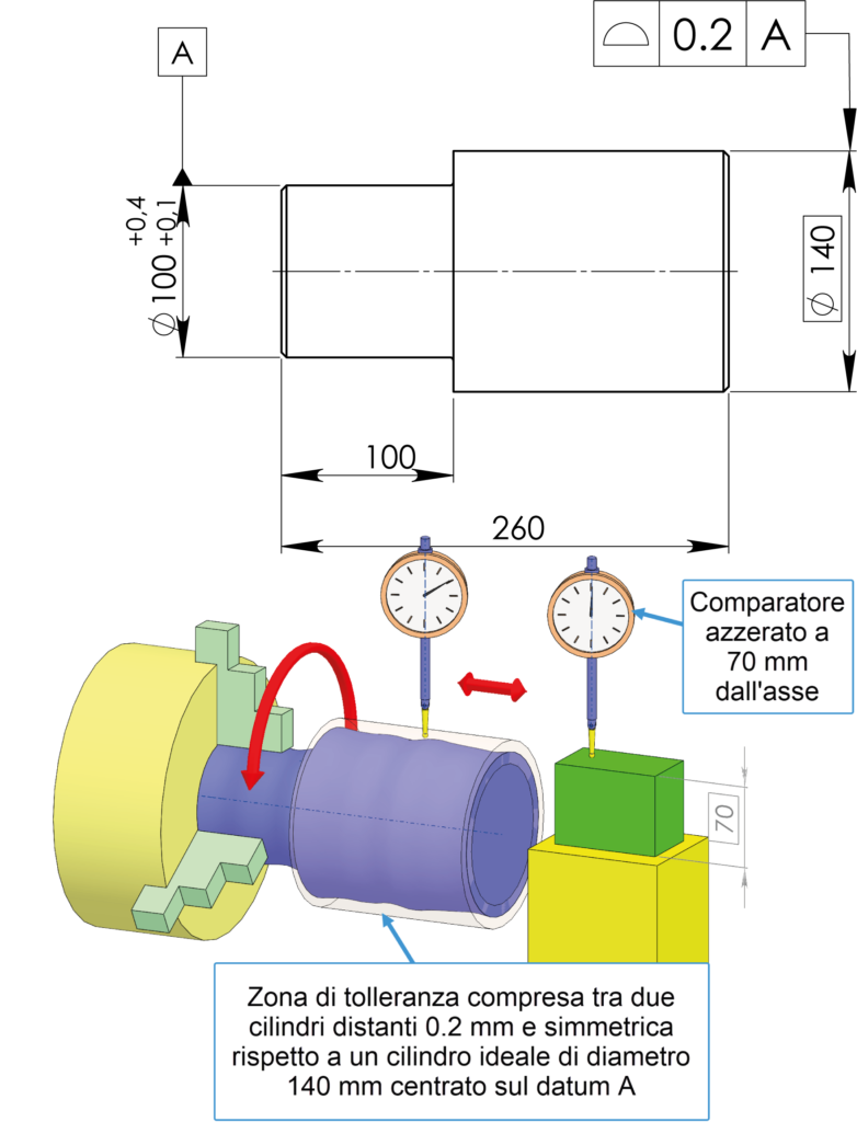 Infine, l’utilizzo della tolleranza del profilo per la specifica della coassialità rappresenta il metodo più completo e versatile in quanto controlla ogni tipo di errore (dimensionali, di forma, di orientamento e di coassialità). Nel caso della figura 6, la zona di tolleranza è compresa tra due cilindri distanti 0.2 mm e simmetrica rispetto a un cilindro ideale di diametro 140 mm, centrato sul datum A. Sebbene rappresenti il controllo più completo in assoluto, il controllo del profilo viene usato raramente per la coassialità a causa dell’elevato costo di collaudo (richiede scansioni 3D o CMM avanzate).