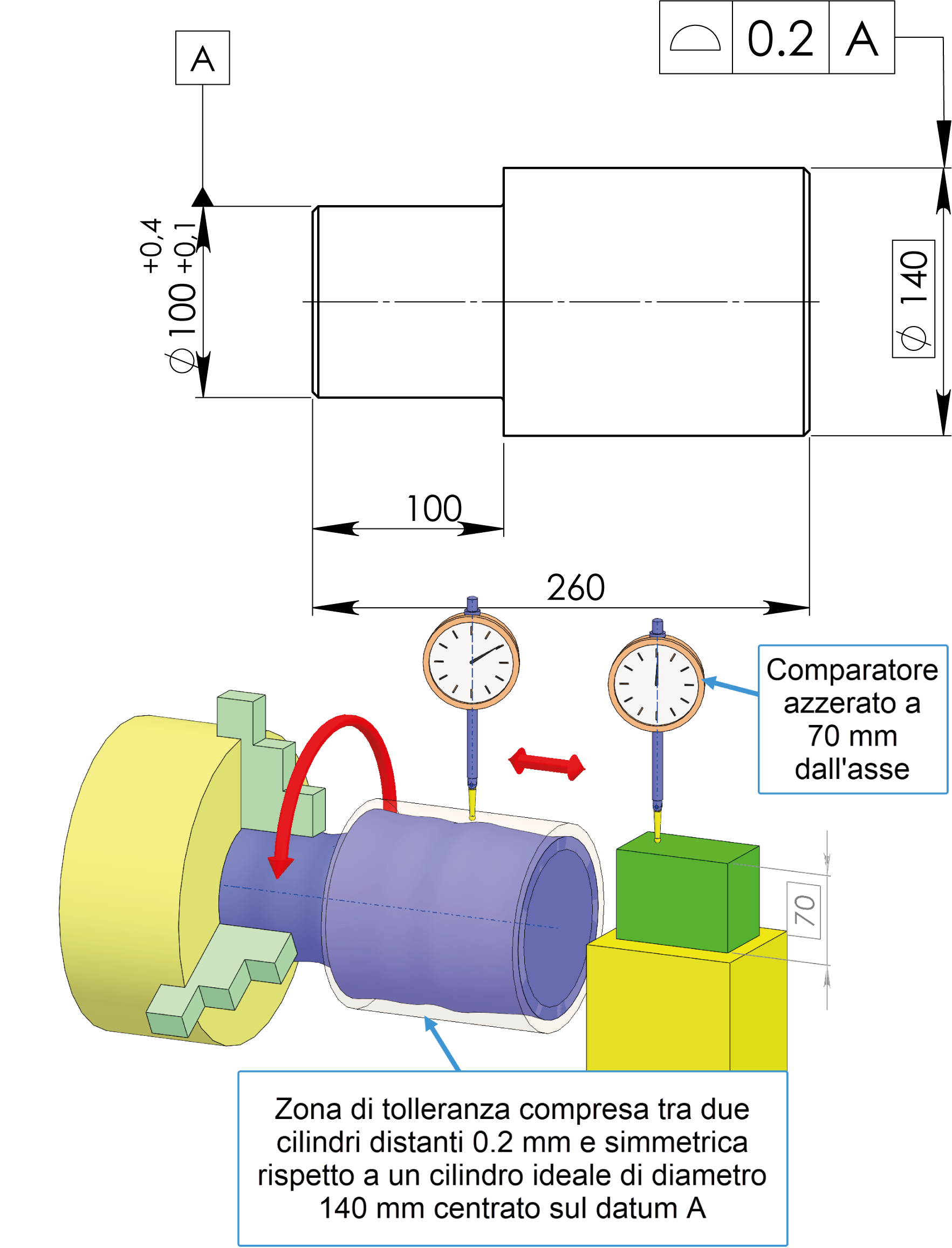 Fig. 6. L’errore di coassialità indicato con una tolleranza del profilo. In questo caso viene controllato l’errore dimensionale e ogni tipo di errore di forma, posizione e di orientamento. L’errore è dato dalla differenza tra il valore minimo e massimo di escursione del comparatore azzerato a 70 mm dall’asse dell’elemento di riferimento.