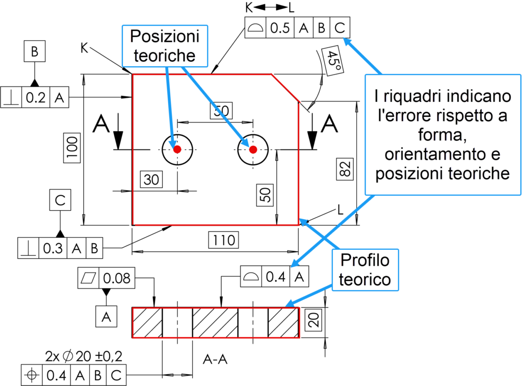 - La tolleranza del profilo, per indicare l’orientamento e posizione della zona di tolleranza.