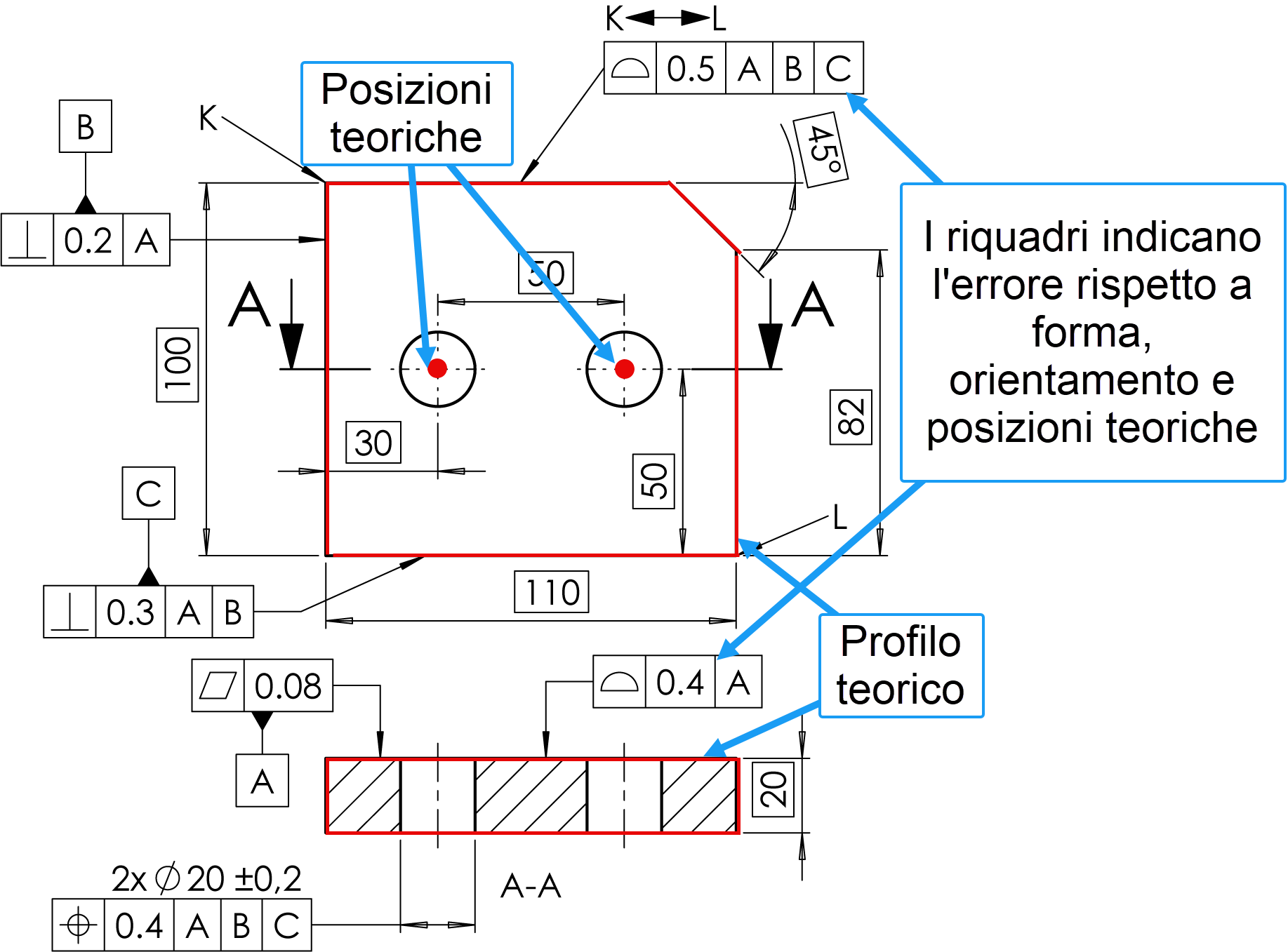 - La tolleranza di posizione per indicare la posizione della zona di tolleranza.