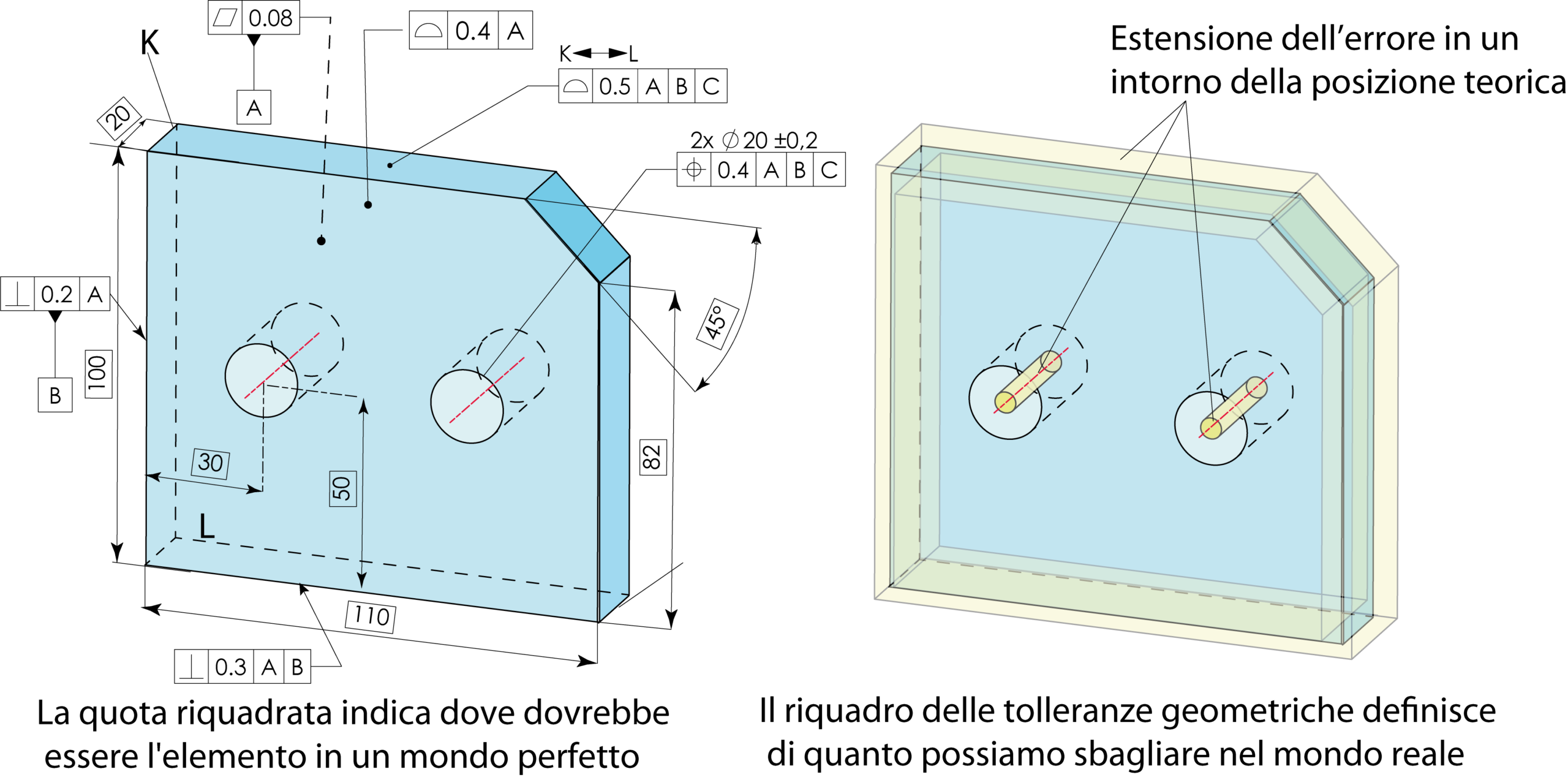 Il problema del disegno tecnico tradizionale è che non esiste un pezzo prodotto perfettamente; tutto ha un margine di errore. Gli ingegneri desiderano però pezzi con forme e dimensioni perfette, ma purtroppo durante la produzione ci sono degli errori inevitabili. L’obiettivo delle quote riquadrate è risolvere questo problema definendo il pezzo perfetto con le cornici rettangolari sulle quote, che però non si usano mai da sole, ma lavorano sempre in coppia con un riquadro di tolleranza geometrica (Tolerance Indicator o Feature Control Frame, fig. 3). I riquadri specificano l’estensione dell’errore rispetto alla forma, orientamento e localizzazione ideale. In sintesi, la quota riquadrata ci dice dove dovrebbe essere l’elemento in un mondo perfetto; il riquadro delle tolleranze geometriche ci dice di quanto possiamo sbagliare nel mondo reale (fig. 4).