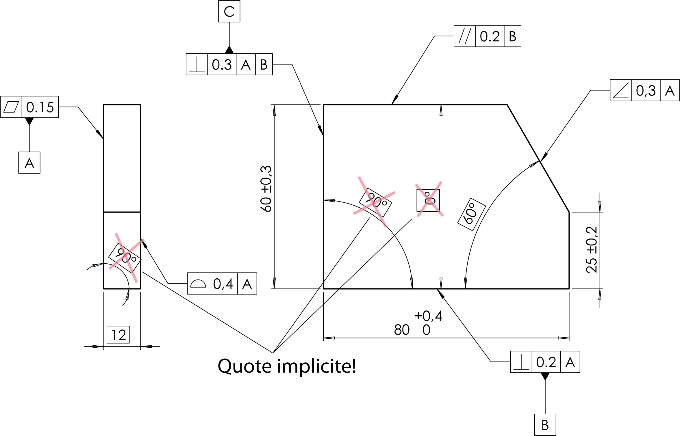 Una quota riquadrata può essere indicata esplicitamente o implicitamente. Quando viene indicata esplicitamente, è rappresentata da una cornice rettangolare che include un valore e talvolta un simbolo associato (ad esempio ø o R). Nei modelli 3D, le quote TED esplicite possono essere disponibili tramite interrogazione del modello. Alcune quote TED sono considerate implicite e, pertanto, non vengono esplicitate sul disegno. Rientrano in questa casistica valori come 0 mm, 0°, 90°, 180° e 270°, in quanto deducibili direttamente dalle relazioni geometriche rappresentate (ad esempio, allineamento, parallelismo, perpendicolarità e la distanza angolare tra elementi equidistanti su un cerchio completo). Per questi motivi, le tolleranze di parallelismo e perpendicolarità usano implicitamente le quote riquadrate (rispettivamente 0° e 90°), e quindi non vanno mai indicate nel disegno (fig. 5).