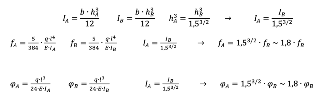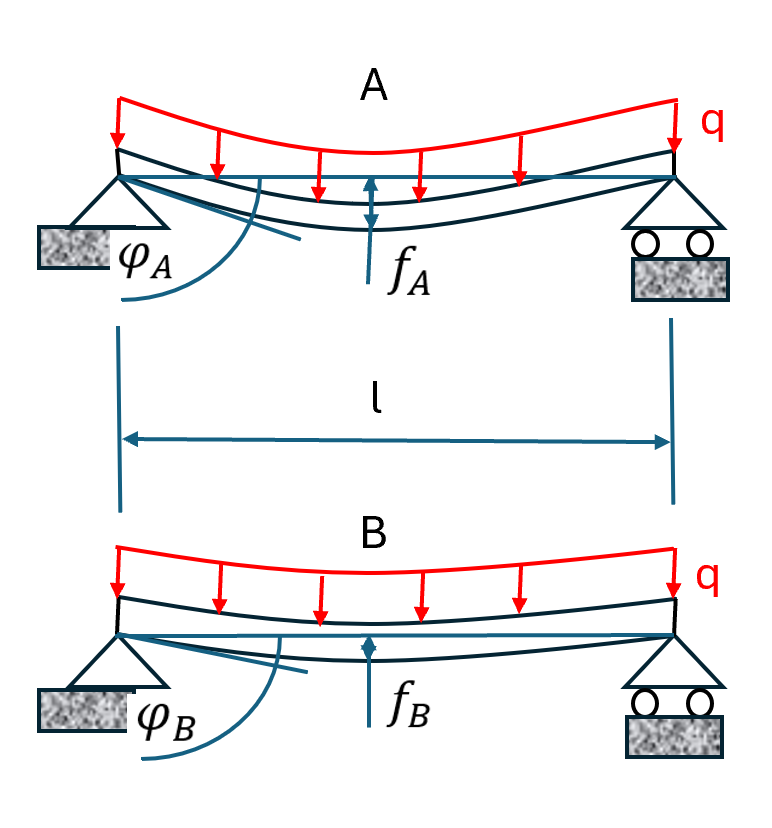 Sia freccia che rotazione in corrispondenza degli appoggi sono inversamente proporzionali al momento d’inerzia e quindi le deformazioni della trave realizzata in acciaio A sono quasi doppie quelle che si avrebbero con l’acciaio B.