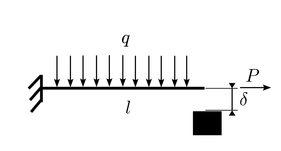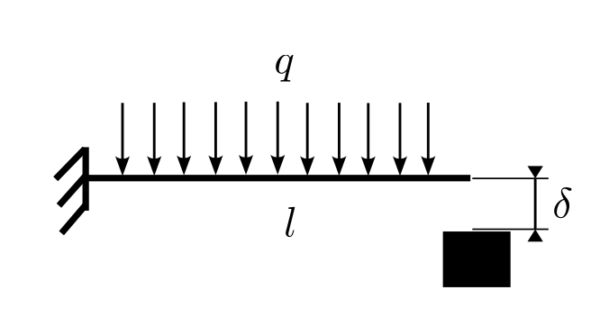 Si consideri una trave a sbalzo sottoposta ad un carico distribuito che entri in contatto con una superficie rigida. Il sistema è caratterizzato da un carico distribuito q = 1 kN/m agente sulla trave di lunghezza L = 1m con rigidezza flessionale EI = 105Nm2. La deflessione massima consentita è pari a δ=1mm.