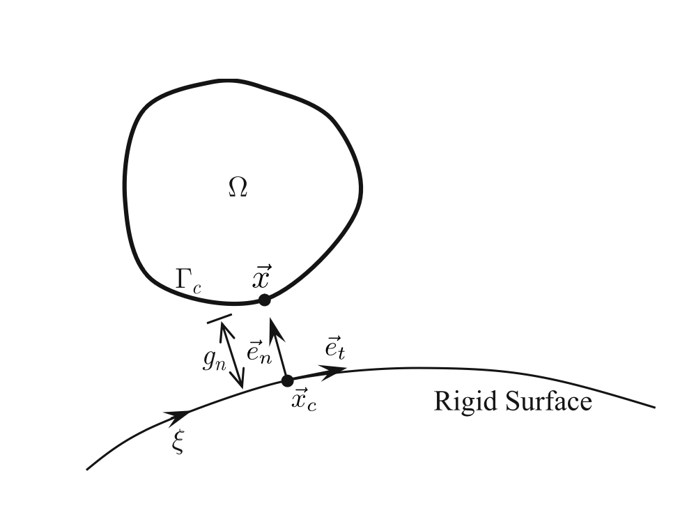 Gli esempi di contatto puntuali descritti nella sezione precedente sono limitati da un punto di vista pratico, poiché la maggior parte dei contatti nelle applicazioni ingegneristiche prevede un contatto distribuito lungo curve o superfici. Nella figura, ΓC denota la potenziale zona di contatto sul corpo deformabile (slave) che può interagire con una superficie rigida (master) a seguito dell’applicazione di un carico.