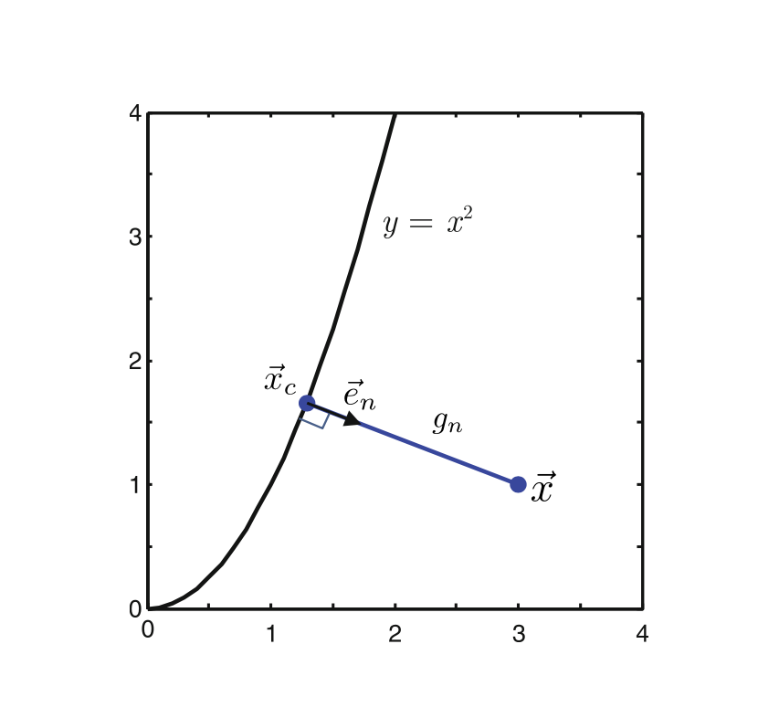 Si consideri la proiezione di un punto x=[3, 1]T sulla superficie rigida parabolica y=x2
