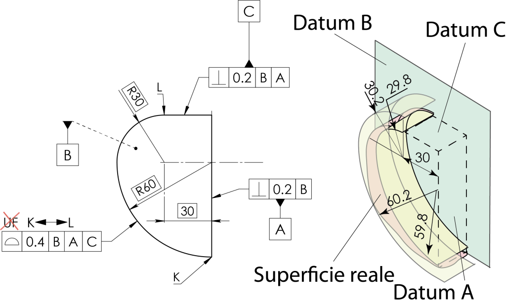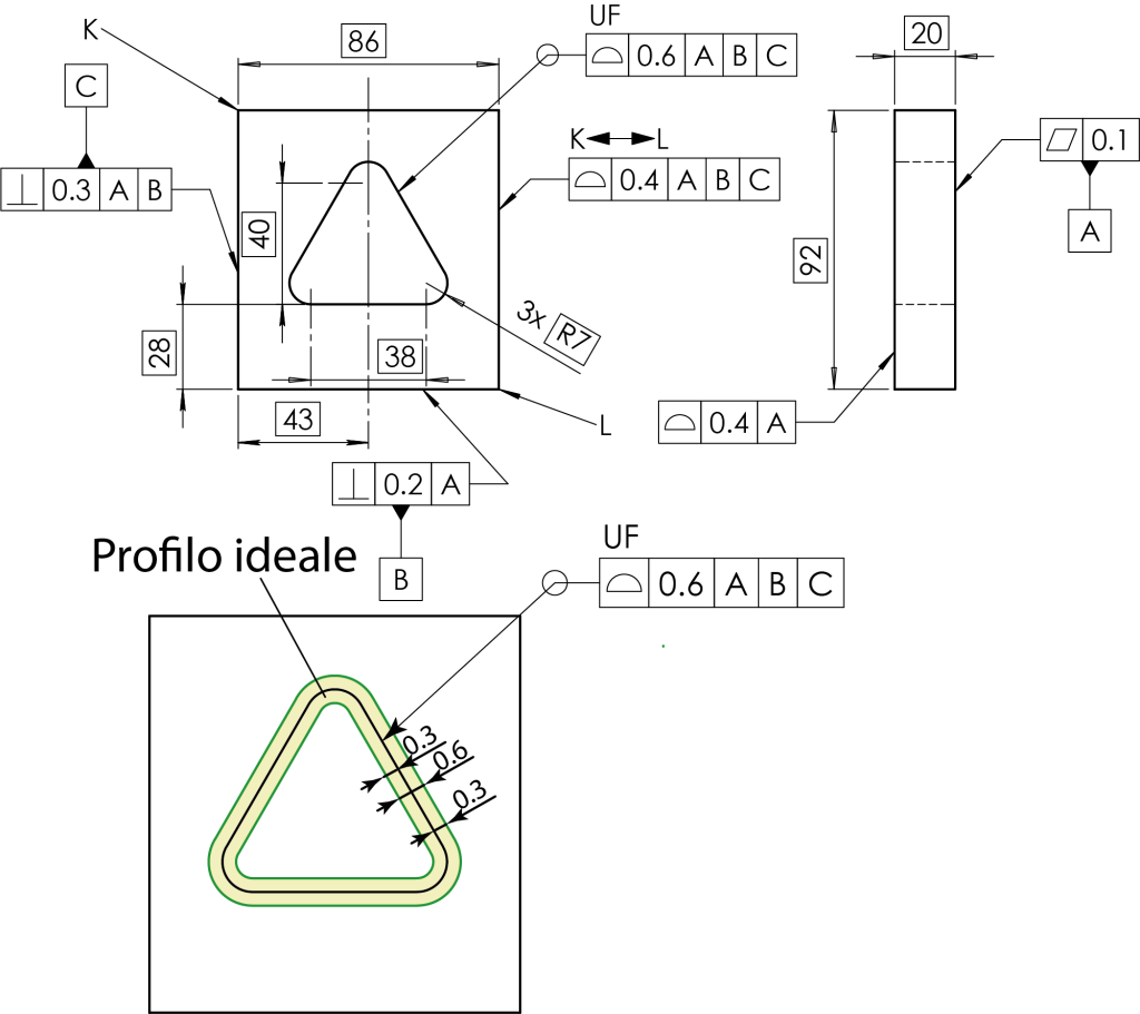 Infine, nel disegno della figura 7 la tolleranza del profilo è utilizzata con un sistema di datum completo che blocca tutti i gradi di libertà non ridondanti della zona di tolleranza. In questo caso il modificatore UF avrebbe potuto essere omesso senza modificare il significato pratico della specifica.