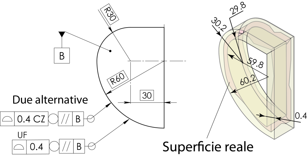 Gli elementi sono considerati indipendenti, ovvero le zone di tolleranza sono indipendenti tra loro. Per evitare ambiguità, il simbolo “all around” è combinato con l’elemento di specifica SZ (Separate Zone) per indicare questa indipendenza. Per combinare il profilo in un’unica superficie è possibile utilizzare il simbolo UF (Unified feature), oppure il modificatore CZ (Combined Zone), che permettono di ottenere lo stesso risultato (fig. 6).