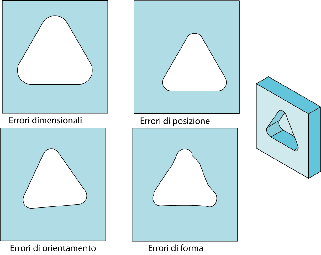 Il contorno di un elemento è definito profilo, e un contorno definito da quote teoricamente esatte è chiamato profilo teorico. Un controllo sul profilo specifica quindi i limiti rispetto al profilo teorico entro i quali deve trovarsi il profilo reale di una superficie e la zona di tolleranza è disposta simmetricamente rispetto al profilo ideale. In definitiva viene rappresentato nel disegno il profilo perfetto (con le quote riquadrate o teoricamente esatte) e si specifica una zona di tolleranza (per default simmetrica) entro cui deve trovarsi il profilo reale (fig. 1). La figura 2 mostra in particolare gli errori controllati dalla tolleranza del profilo di 0.6 mm sulla scanalatura triangolare del componente di figura 1. Per default la zona di tolleranza è simmetrica rispetto al profilo ideale, ma è possibile indicare una zona di tolleranza non simmetrica attraverso l’utilizzo di opportuni modificatori.