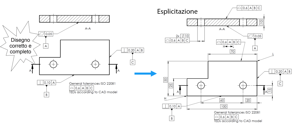 La figura 3 illustra la grande potenzialità della specifica della tolleranza del profilo, utilizzata come tolleranza generale con la ISO 22081: nel disegno di un componente basta indicare e qualificare i tre datum per ottenere una quotatura completa e univoca (esplicitata nel disegno a destra della figura 3).
