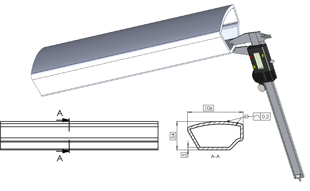 La figura 4 mostra un esempio di applicazione delle tolleranze del profilo di una linea sul bordo esterno e interno di un profilato: la verifica deve essere svolta con una macchina di misura, ma per ottenere un primo risultato abbastanza attendibile è possibile utilizzare un calibro che potrebbe controllare lo spessore in più punti. In questo caso lo spessore deve essere compreso tra 4,8 e 5,2 mm.