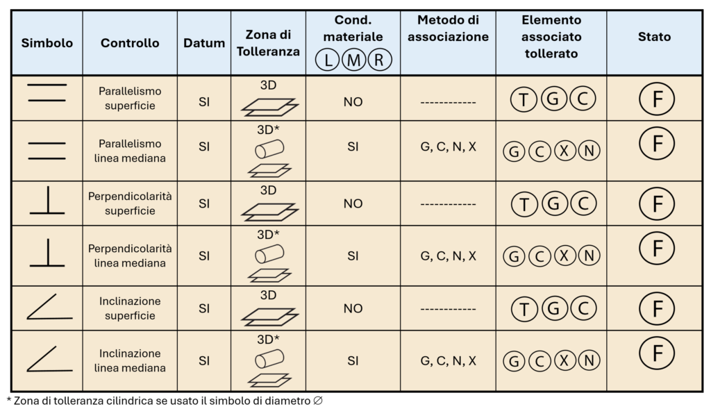 Un controllo di parallelismo definisce lo scostamento dal parallelismo di una singolarità geometrica e viene usata per geometrie a 180° una, rispetto all’altra. Un controllo di perpendicolarità definisce lo scostamento dalla perpendicolarità di una singolarità geometrica ed è usata per geometrie a 90°. Un controllo di inclinazione definisce lo scostamento di una singolarità geometrica rispetto ad un determinata inclinazione e viene usata per geometrie che non sono né a 180°, né a 90° l’una rispetto all’altra.