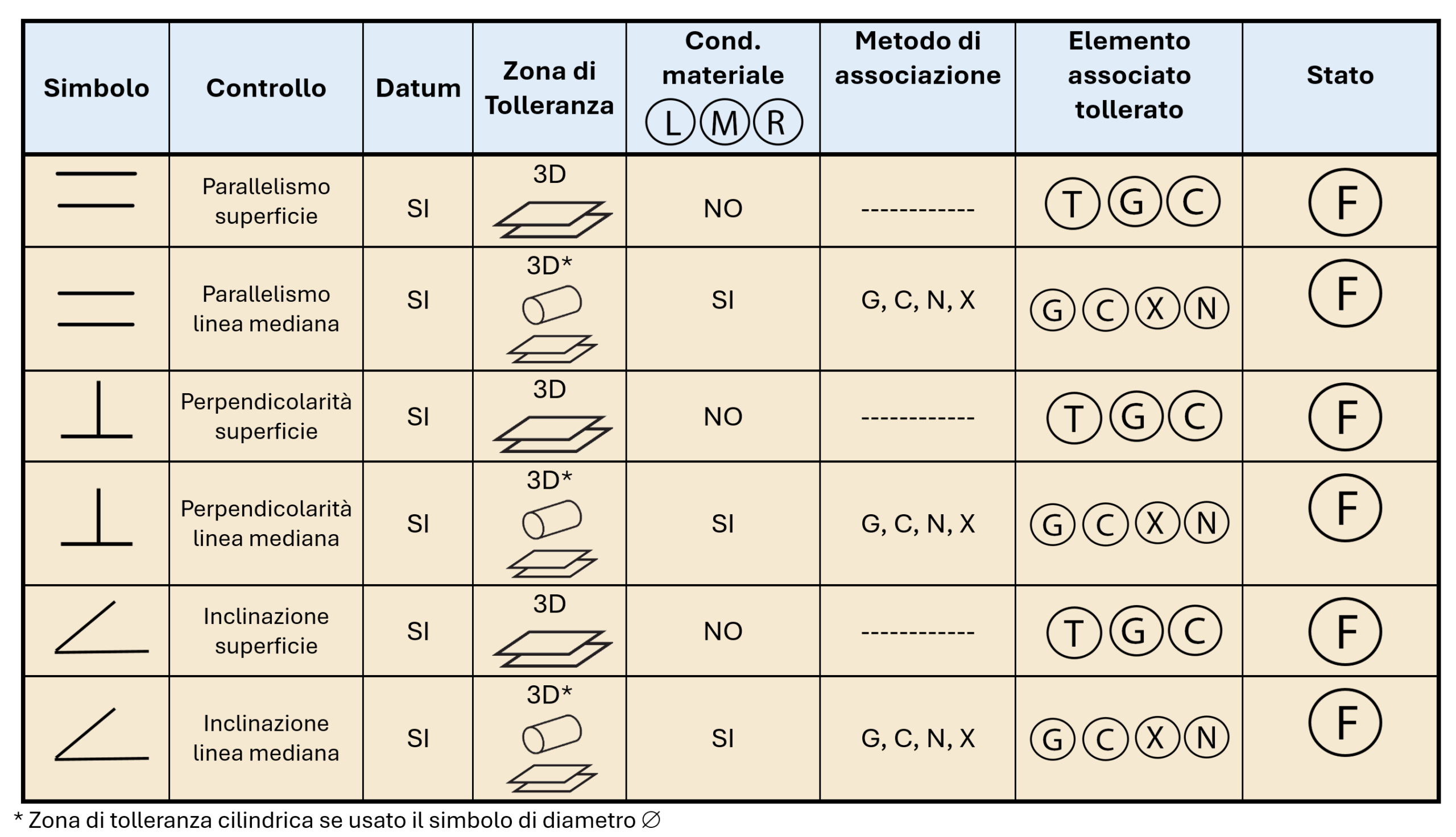La tabella di figura 2 mostra uno schema riepilogativo dei controlli di orientamento, con particolare riferimento ai metodi di associazione per la verifica degli errori e l’applicabilità delle condizioni di massimo e minimo materiale. Le tolleranze di orientamento, secondo lo schema della tabella, possono essere specificate in due modalità differenti, cioè applicate a una superficie piana oppure a un asse (linea mediana derivata) di un elemento con dimensione (feature of size, come fori, alberi).