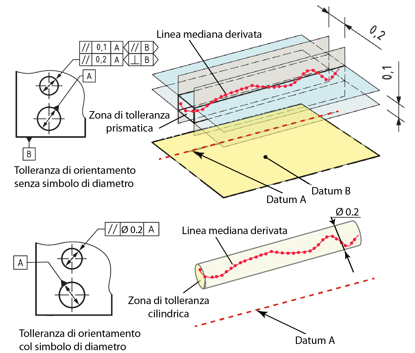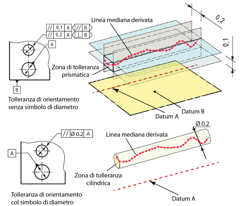 Infatti, nel controllo di orientamento di un asse, è possibile specificare una zona di tolleranza di forma prismatica o cilindrica mediante l’omissione o indicazione del simbolo di diametro, come è illustrato in figura 3. Nel primo caso risulta necessario orientare ulteriormente la zona di tolleranza mediante i simboli addizionali dei piani di orientamento e l’indicazione di un datum secondario; il simbolo di diametro crea invece una zona di tolleranza cilindrica univocamente orientata rispetto al datum.