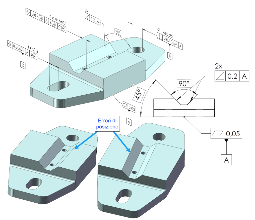 Molti progettisti commettono l’errore di limitare un controllo di orientamento mediante le tolleranze dimensionali. Oltre a determinare una verifica del pezzo problematica, si corre il rischio di specificare delle tolleranze molto strette per cui risulta molto più opportuno utilizzare le tolleranze geometriche di orientamento come illustrato in figura 1. In questo caso le tolleranze dimensionali diventano più ampie e il controllo del pezzo è naturalmente più semplice.