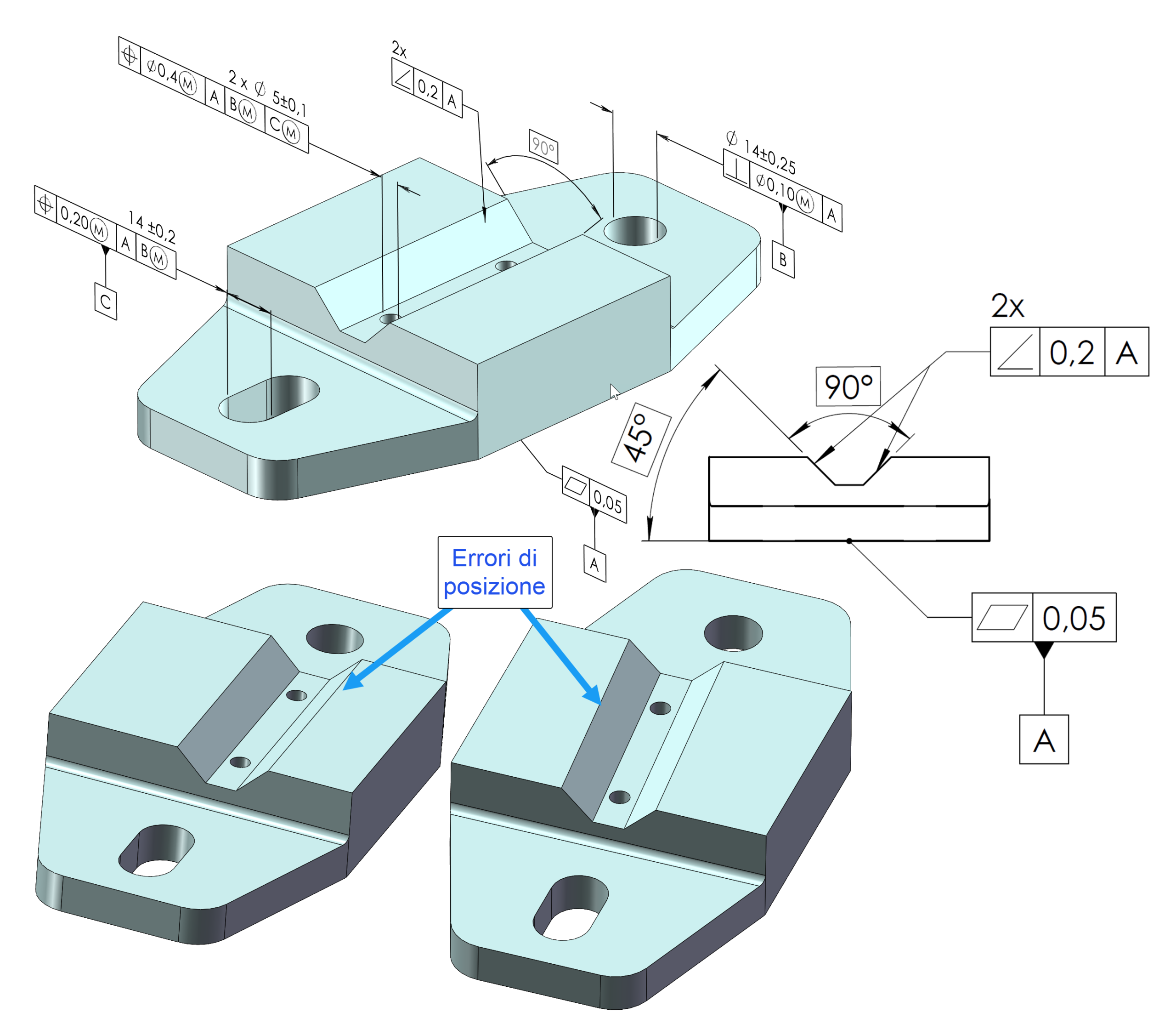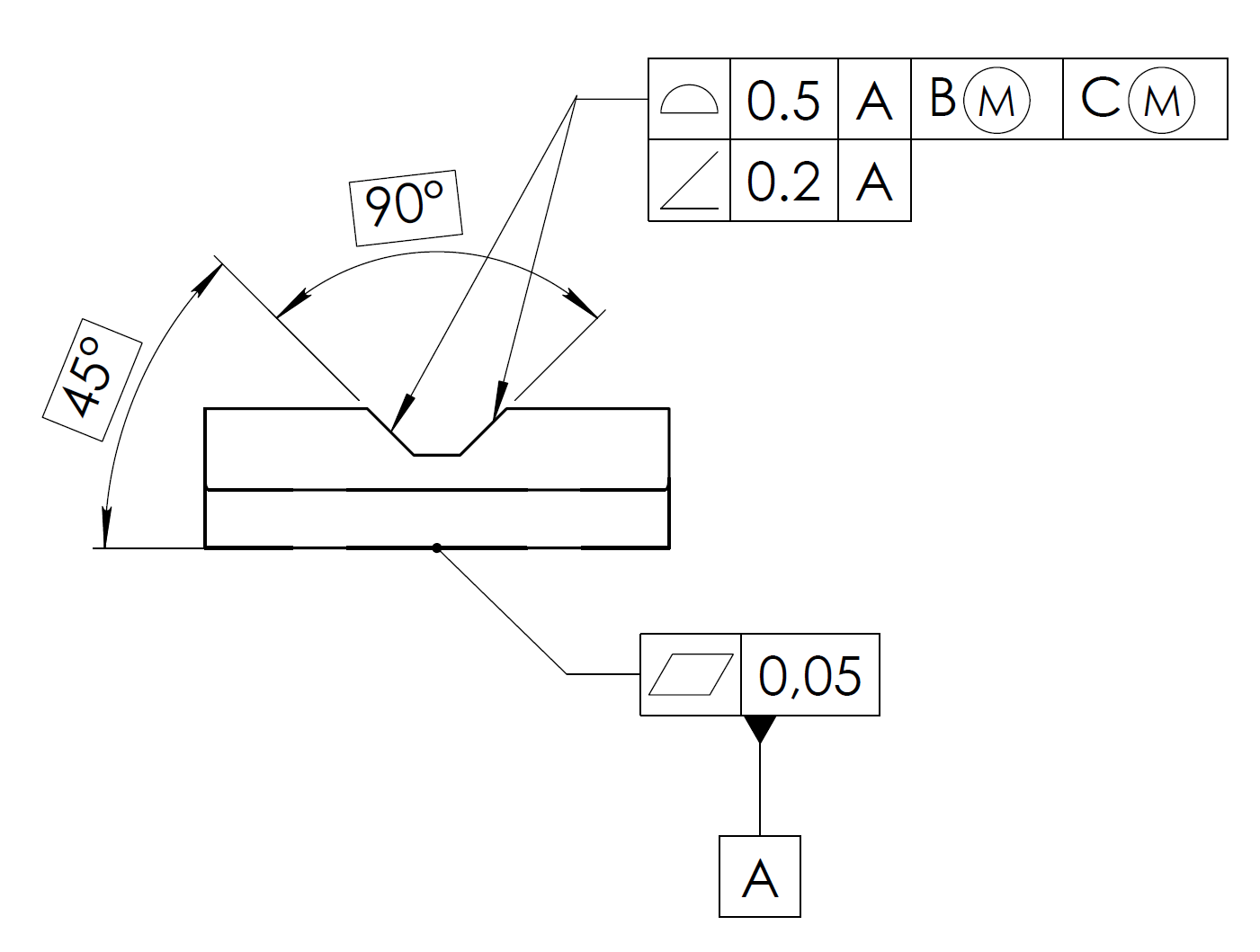 Uno degli errori più frequenti del disegno è l’utilizzo di una tolleranza geometrica di orientamento sia per orientare che per localizzare gli elementi di un pezzo. Si consideri ad esempio il componente di figura 4: per ognuna delle due superfici inclinate, la zona di tolleranza è limitata da due piani paralleli, ad una distanza uguale alla tolleranza, ed inclinati di 45°, rispetto al datum A (nel disegno la quota angolare deve essere riquadrata!). Il disegno in questo caso è incompleto e può dare origine a dei contenziosi in quanto manca il controllo della localizzazione delle due superfici. Per localizzare e orientare, si può aggiungere una tolleranza del profilo che consente di controllare anche l’errore di forma delle due superfici (fig. 5). In questo caso, il profilo localizza la superficie rispetto ad un sistema di riferimento a 3 piani, mentre la tolleranza di inclinazione perfeziona l’orientamento rispetto al datum A.
