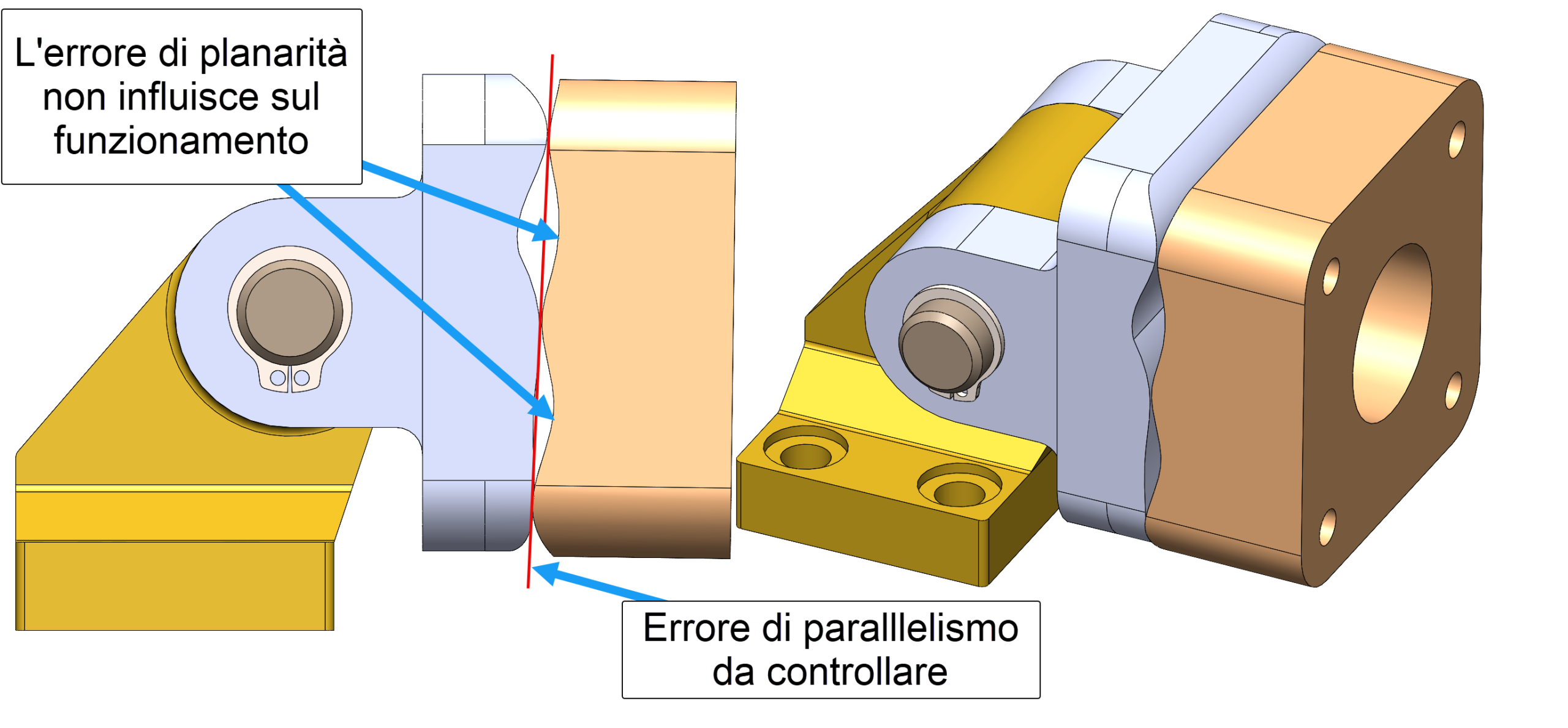 Applicando una tolleranza di orientamento a una superficie piana comporta purtroppo anche una limitazione dell’errore di forma (planarità), e quindi, nel caso di superfici non perfettamente piane, si potrebbero correre il rischio di scartare dei pezzi funzionanti. Infatti, gli errori di planarità potrebbero non influire sul funzionamento, in quanto l’accoppiamento tra le superfici a contatto avviene solitamente nei punti più alti e quindi potrebbero non incidere sul montaggio (fig. 6). Il progettista vorrebbe però limitare gli errori di parallelismo.