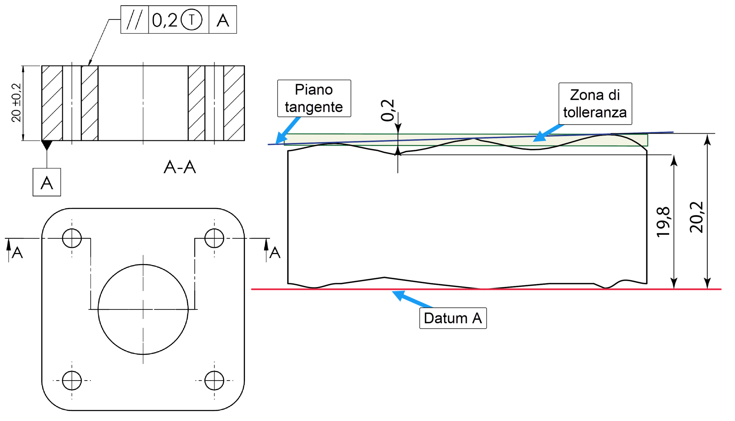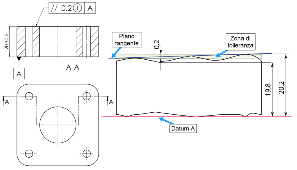 Per evitare questo problema, si può ricorrere al concetto di piano tangente, vale a dire un piano tangente esterno alla superficie da controllare e indicato nel riquadro delle tolleranze con una T cerchiata Ⓣ, come in figura 7. Con questa indicazione, il controllo non viene applicato sulla superficie reale, ma ad un piano tangente, la cui posizione deve essere compresa tra due piani distanti la tolleranza e paralleli al riferimento. In questo caso il modificatore piano tangente consente di ignorare gli errori di planarità. Naturalmente, il modificatore piano tangente Ⓣ può essere applicato anche ad una tolleranza di perpendicolarità, inclinazione o del profilo di una superficie piana.