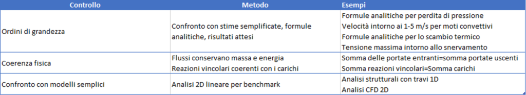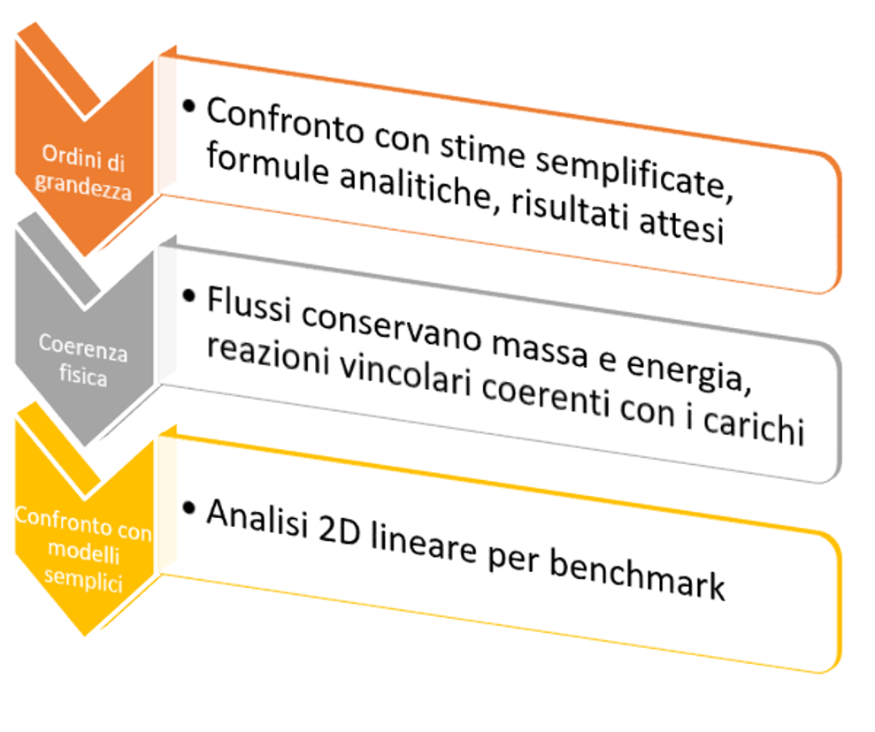 Naturalmente, la prima strategia da adottare nei processi di simulazione consiste nell’assumere un approccio fortemente critico nei confronti dei risultati: considerarli inizialmente come potenzialmente errati e riconoscerne la correttezza solo dopo aver raccolto prove indipendenti e coerenti a sostegno della loro validità. Questo atteggiamento permette di mantenere costantemente il controllo sul modello e di evitare che la fiducia nel software sostituisca il giudizio ingegneristico necessario per interpretare correttamente i risultati.