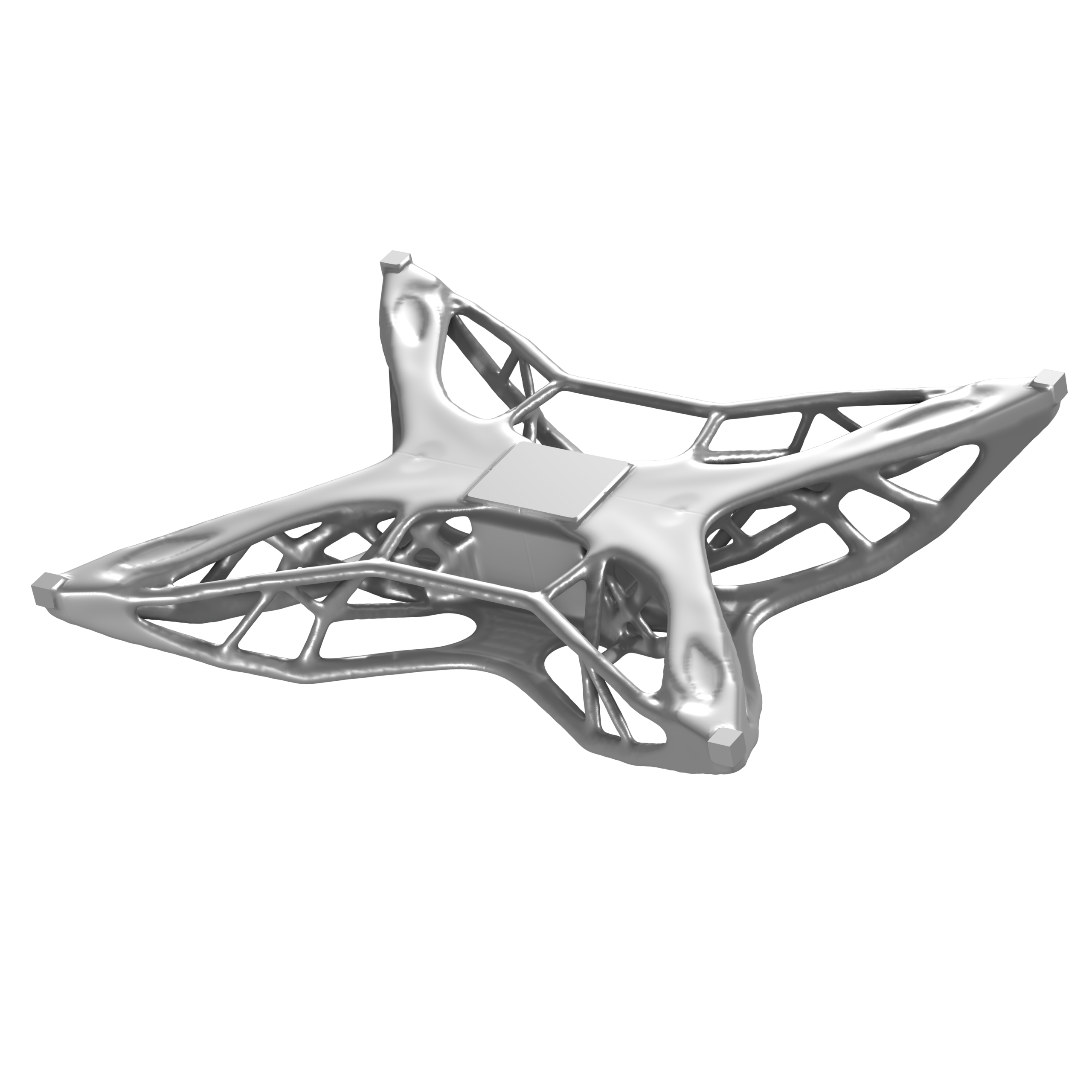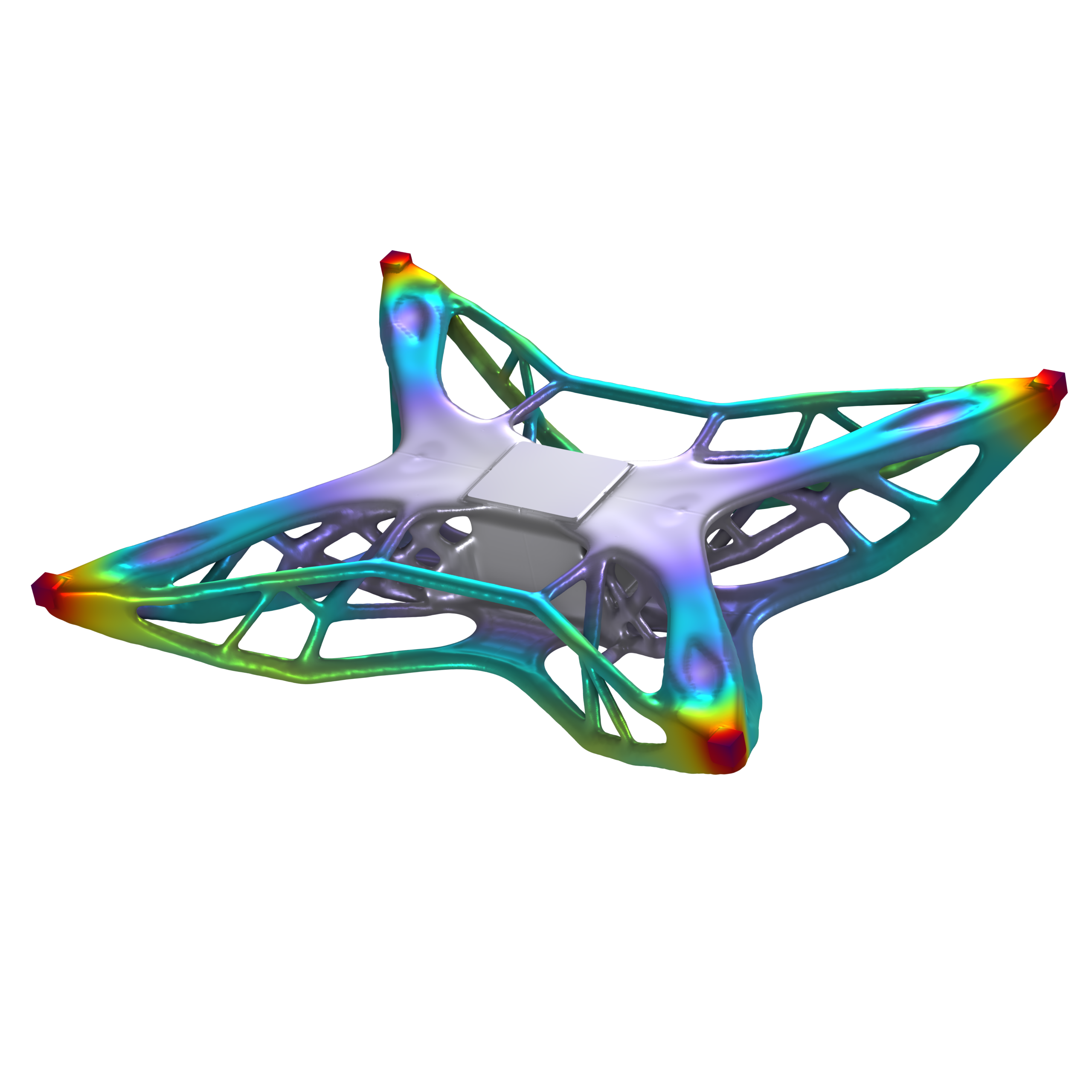 In questo esempio di ottimizzazione topologica, il calcolo inizia semplicemente con la batteria del drone al centro e i quattro motori agli angoli. La parte originariamente modellata viene replicata per costituire il resto del progetto e il software aggiunge materiale per collegare i motori tra loro e la batteria al centro. Il rapporto rigidità/peso del materiale viene quindi regolato fino a quando il risultato finale ha una chiara interpretazione fisica.