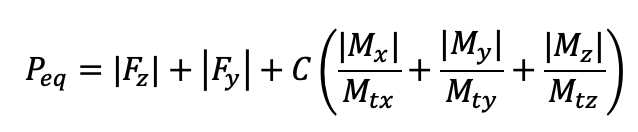 In questa equazione lineare, la costante  rappresenta il coefficiente di carico dinamico di base, mentre i termini al denominatore indicano i momenti dinamici ammissibili dichiarati dal costruttore per lo specifico asse di rotazione. Questa formulazione fornisce un’approssimazione analitica cautelativa, tendendo a sovrastimare la sollecitazione reale derivata dalla combinazione dei vettori per garantire ampi margini di sicurezza nella successiva fase di dimensionamento a fatica. Per compensare l’incertezza intrinseca legata alle specifiche condizioni operative, si considera un coefficiente empirico, definito fw, comunemente noto come fattore di carico dinamico o fattore di urto. L’equazione correttiva diviene pertanto Pc = Peqfw, dove Pc rappresenta il carico equivalente di calcolo finale da immettere nelle equazioni di durata. Per traslazioni lente a velocità inferiori a 15 m/min in totale assenza di urti, fw assume valori prossimi all’unità. Diversamente, in presenza di velocità elevate superiori ai 60 m/min, lavorazioni gravose accompagnate da forti vibrazioni trasmesse dal mandrino o carichi d’urto repentini, fw può superare il valore di 2,5.
