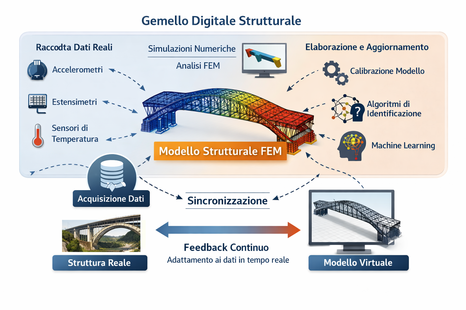 Questo aggiornamento continuo introduce una forma di “apprendimento” del sistema, che consiste nel fatto che il modello evolve parallelamente alla struttura fisica. Dal punto di vista ingegneristico, ciò permette di distinguere tra variazioni temporanee, legate alle condizioni operative, e cambiamenti permanenti, associati a processi di degrado. Il gemello digitale diventa così uno strumento di interpretazione avanzata dei dati, capace di fornire al progettista indicazioni quantitative sull’effettivo stato della struttura.