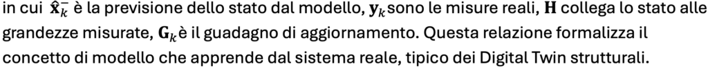 Dal punto di vista progettuale, la correlazione modello–realtà non deve essere interpretata come un semplice esercizio di fitting numerico, ma come un mezzo per comprendere quali ipotesi di progetto risultano più critiche. Un modello calibrato non è necessariamente più complesso, ma sicuramente è più rappresentativo, poiché incorpora le informazioni provenienti dall’esperienza operativa del sistema. Al termine di questa calibrazione, il progettista stesso avrà compreso molte più informazioni e dettagli sul funzionamento del sistema che ha di fronte. Il Digital Twin integra dati sperimentali attraverso una stima iterativa dello stato strutturale.