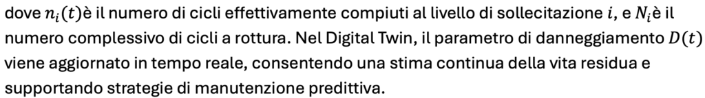 Una volta definita un’architettura coerente e calibrato il modello attraverso dati sperimentali, il Digital Twin strutturale diventa uno strumento efficace per la predizione del comportamento in esercizio. La peculiarità di questo strumento è la possibilità di anticipare scenari di funzionamento reali, difficilmente riproducibili in fase di collaudo, e di valutare l’impatto delle scelte progettuali lungo l’intero ciclo di vita del prodotto. La predizione non si limita a una stima delle grandezze strutturali istantanee, ma si estende all’evoluzione temporale delle prestazioni, includendo fenomeni cumulativi come la fatica e il degrado.