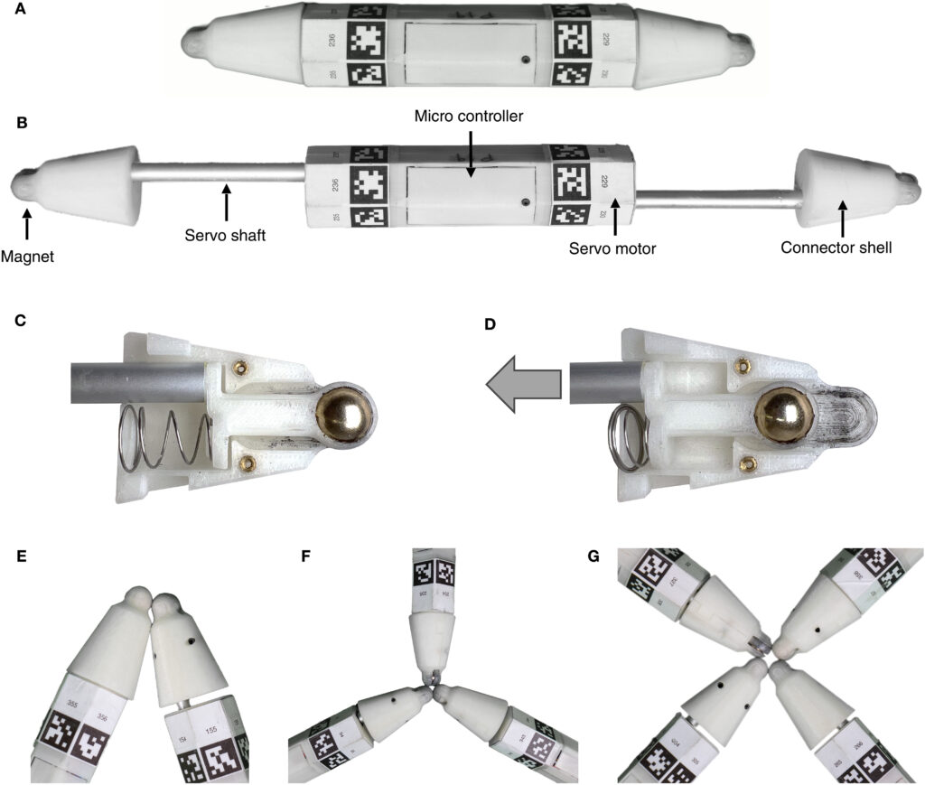 I Truss Links possono espandersi e contrarsi, agganciarsi e sganciarsi, e connettersi simultaneamente a più altri Truss Links. (A) Un Truss Link contratto misura 28 cm di lunghezza e pesa 280 g (B). Quando è completamente esteso, può aumentare la propria lunghezza di oltre il 53%, raggiungendo i 43 cm. Le immagini (C e D) mostrano l’interno del connettore magnetico rispettivamente in stato attivo, con il magnete esposto sulla punta, e in stato completamente contratto, cioè inattivo, con il magnete retratto. La molla conica di compressione all’interno del connettore riporta il magnete allo stato attivo dopo la retrazione, rendendo il Truss Link pronto per una nuova connessione. Il magnete sferico in neodimio è mantenuto in posizione da un supporto magnetico, che ne consente la rotazione libera fino a raggiungere una posizione di equilibrio quando si avvicina a un altro magnete. Questo meccanismo garantisce una connessione solida tra più link da un’ampia e continua gamma di angolazioni. Vengono mostrati collegamenti tra (E) due, (F) tre e (G) quattro connettori.