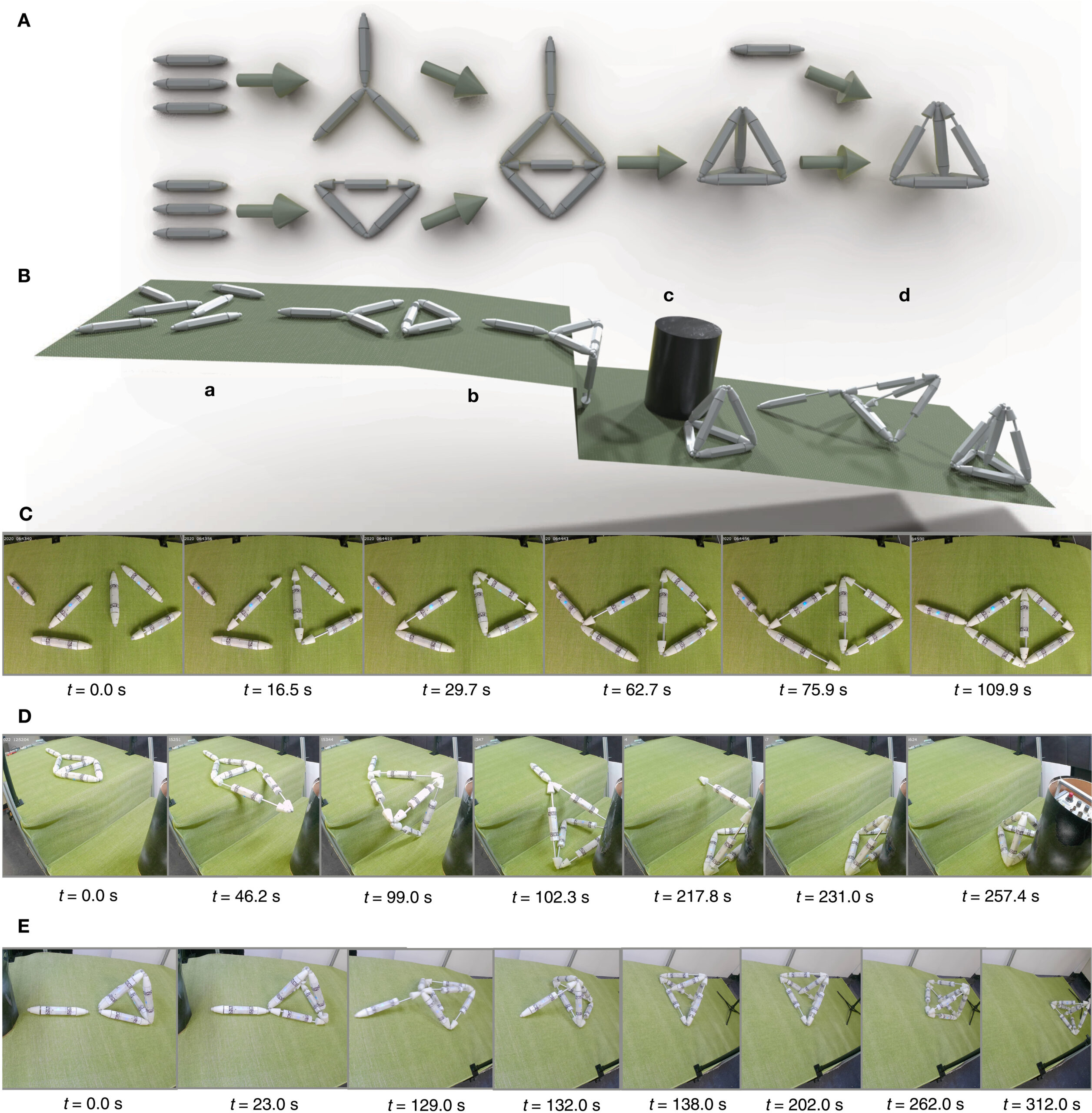 La sezione (B) mostra una vista laterale dell’ambiente sperimentale, non in scala, con etichette da (B-a) a (B-d) che indicano le aree in cui si sono verificate le diverse transizioni illustrate nelle immagini (C), (D) ed (E). Queste sequenze fotografiche documentano rispettivamente la formazione del diamante con coda, la trasformazione in robot tetraedrico e infine la configurazione finale a tetraedro con meccanismo a cricchetto.