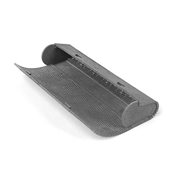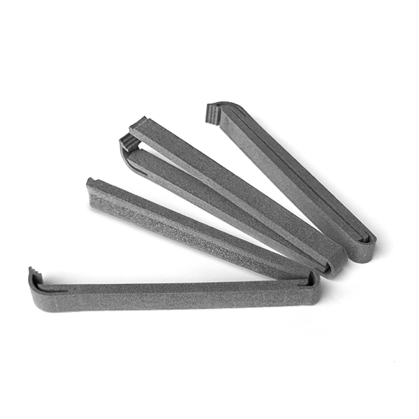 Le caratteristiche del Nylon PA11 Gen 2 lo rendono particolarmente indicato per componenti che devono mantenere prestazioni nel tempo. Ne sono esempi cerniere flessibili, snap-fit, clip, elementi di bloccaggio elastici, boccole, supporti antivibrazione e impugnature ergonomiche. In queste applicazioni, la combinazione di duttilità, resistenza agli urti e tenacità consente di progettare geometrie evolute, con zone di flessione controllata e funzioni integrate che sfruttano pienamente il potenziale della stampa 3D MJF.