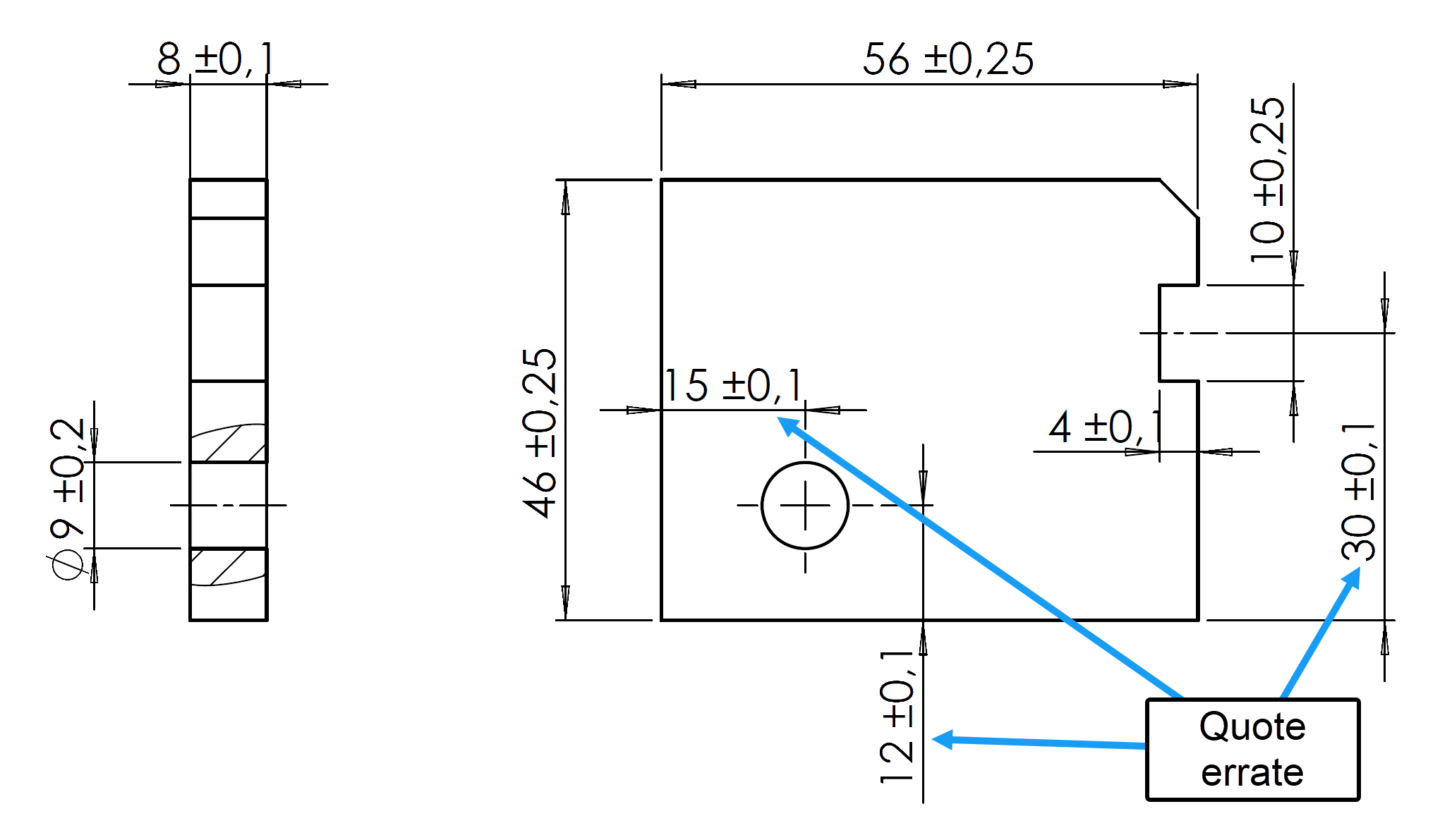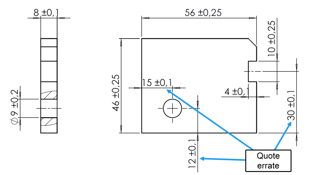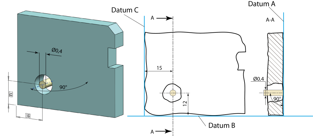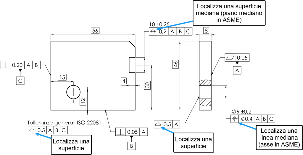 La figura 4 mostra la quotatura corretta del componente di figura 1 secondo lo standard ISO. Le tolleranze dimensionali sono solo applicate a feature of size (foro e scanalatura), mentre le quote riquadrate controllano le distanze delle zone di tolleranza dai datum funzionali. Il simbolo di posizione è stato usato anche per controllare la localizzazione di una scanalatura. La superficie mediana estratta deve essere contenuta tra due piani paralleli distanti 0.2 mm e disposti simmetricamente rispetto al piano mediano dell’elemento, perpendicolare al datum A e la cui posizione è fissata con una quota teoricamente esatta rispetto al datum B.