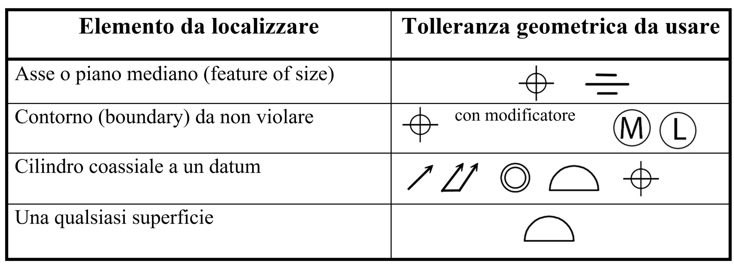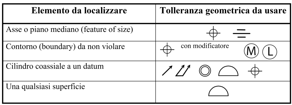 La tabella della figura 2 stabilisce le tolleranze geometriche da usare in funzione dell’elemento geometrico da localizzare. Per localizzare un asse o un piano mediano di un elemento dimensionabile (feature of size), si può usare la tolleranza di posizione o di simmetria; se si vuole localizzare il contorno di una feature of size (ad esempio il bordo di un foro per assicurare il passaggio dInel gambo di una vite), è consigliabile aggiungere il modificatore di massimo o minimo materiale.