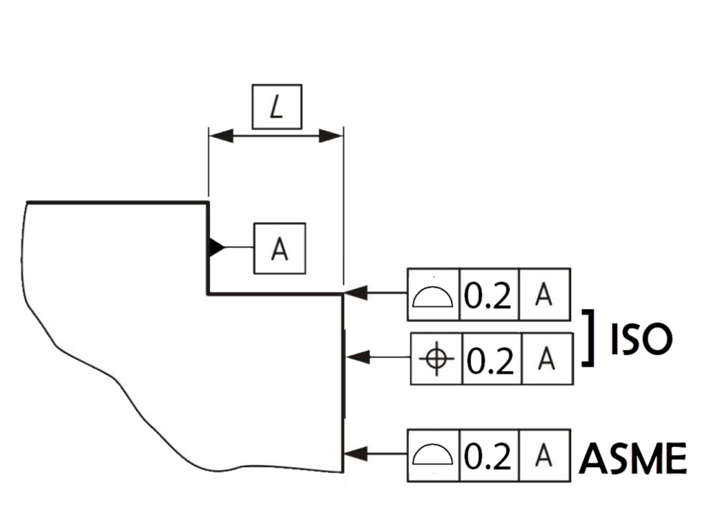 Per localizzare un cilindro rispetto a un asse di riferimento, è possibile usare, oltre alla localizzazione, il controllo di oscillazione, il profilo o la coassialità. Infine, per localizzare una superficie rispetto a uno o più riferimenti, si può utilizzare il controllo del profilo. Esiste una sostanziale differenza tra la specificazione di una tolleranza di posizione tra le norme ISO e le norme ASME. Le norme ASME precisano, senza alcuna ombra di dubbio, che il simbolo di localizzazione debba essere utilizzato solo su “feature of size” (cioè assi e piani mediani). Le norme ISO consentono invece di utilizzarlo per localizzare superfici (fig. 3). Per evitare errori di interpretazione, si consiglia di seguire sempre le indicazioni della norma ASME.