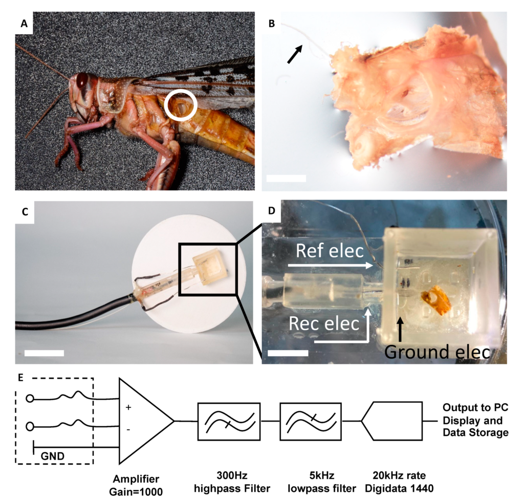( A ) La membrana timpanica dell’orecchio di locusta che viene estratto dall’animale per essere inserito sul robot